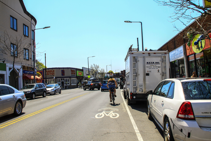 I am including a picture of me biking through Jamaica Plain, which captures the spirit of my process (A friend took this when she joined me on a ride to take pictures of different types of bike lanes in Boston). I tried to get a good understanding of the biking situation by talking with people who have been involved in the politics, going for rides myself, and visiting a bike shop that one of my interviewees (Steve Miller) told me about.