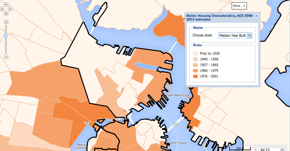 I was interested in comparing geographical racial divisions in Charlestown with how old the houses were and how rich the residents were. Poorer residents tend to live in newer buildings (apartment blocks as opposed to red-brick houses) and tend to be of non-white origin. Here I’ve attached the map that shows how the older houses are on the left (on this map) side of the area.