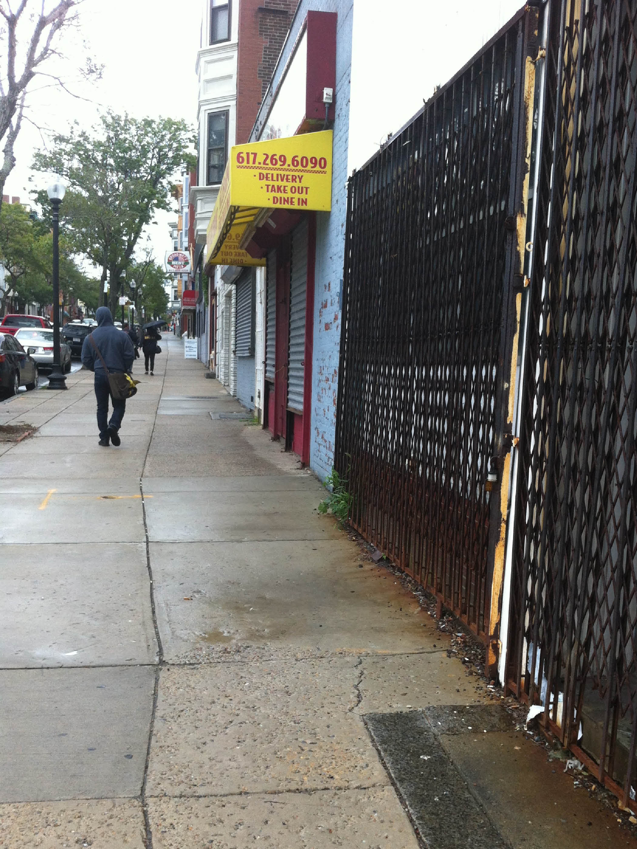 I took this photo just at the intersection of West Broadway Street and E street, I feel this photo clearly shows signs of physical decay, such as the abandoned gated store, plants growing up a building on the right, and the unpainted chipped walls of a takeout store. I feel this photo shows one side of the South Boston that of an area physically on the decline and few residential caretakers concerned about maintaining its upkeep.