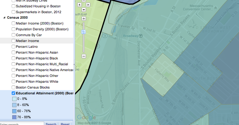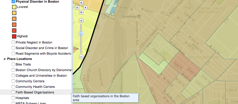 Showing the level of Physical Disorder along the route I walked (West Broadway street to Dorchester street). I feel that for the most part this map mirrors my personal findings on my walk, namely that the physical appearance of Broadway St deteriorated as I headed towards Dorchester Street. I was slightly perplexed however to see that according to the map I created that the area just before Dorchester Street had supposedly lower levels of physical disorder than that of the intersections with D street and E street in contrary to my findings.