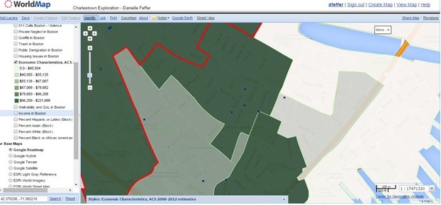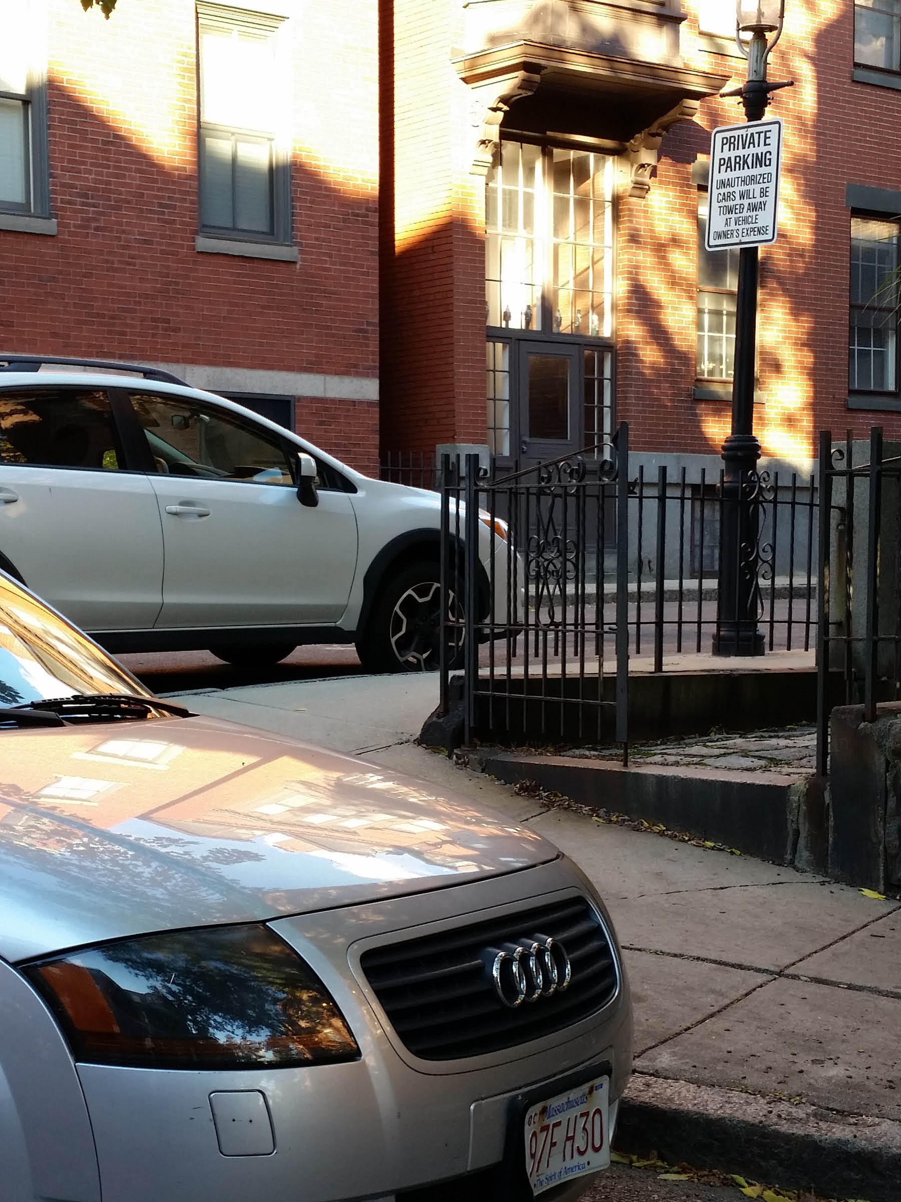 This photo was taken at the intersection of Wallace Ct and Winthrop Street (the Audi is parked on Winthrop Street), which is very close to the Bunker Hill Monument, and in one of the wealthiest areas of Charlestown. I thought that the mid-sized Audi, the charming lamppost, and high-end townhouse in the background all reflected the wealth of the area very well. This was also representative of several blocks surrounding this intersection in that the homes and cars all looked fairly similar to these.