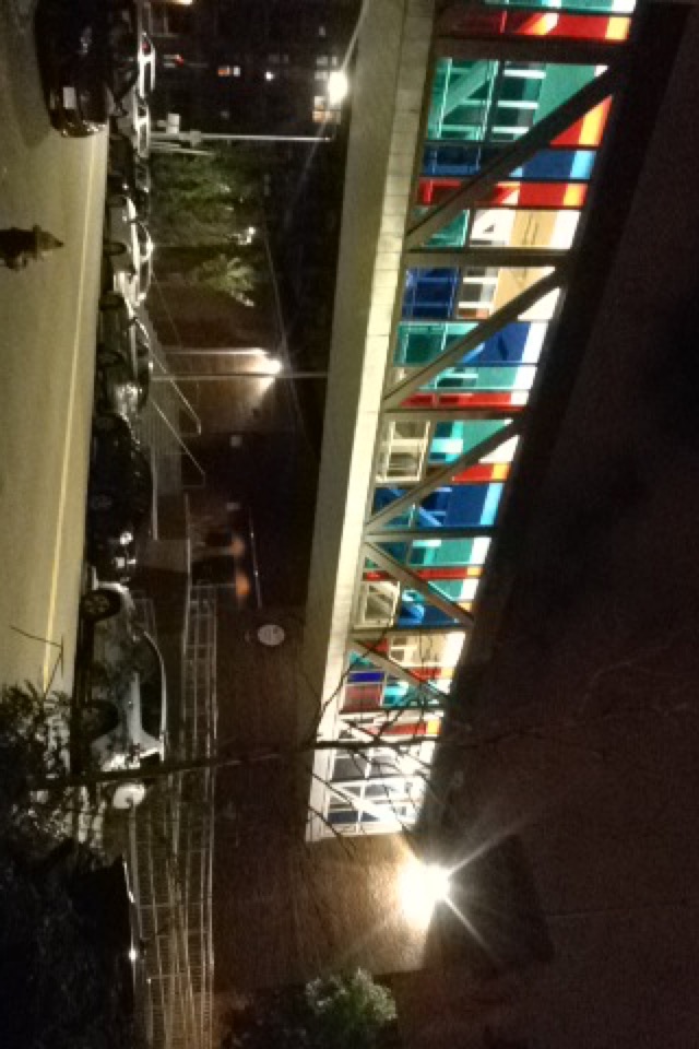 This photograph shows an overhead bridge connecting the Charlestown Community Center to a building on the opposite side of Medford Street. The overpass is right behind the projects in Charlestown, which have now been squeezed into the Northern-most section of the neighborhood. The structure was interesting because of the use of the multicolored stained glass panels. It reminded me about discussions about the impact of art in public spaces. Does the addition of color uplift, or inspire particular behavior? The overpass was well lit at night, and provided a cheerful break from the dark, brick-lined, upward sloping streets of Charlestown, which I found claustrophobic.