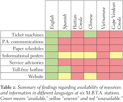 I report on research to investigate the availability of information and services in languages other than English at six M.B.T.A. subway stations, and frame these results with data regarding language usage in Boston. I then analyze the problem (almost complete lack of available services in foreign languages) and finish with policy recommendations for the M.B.T.A.