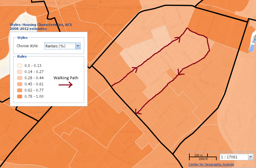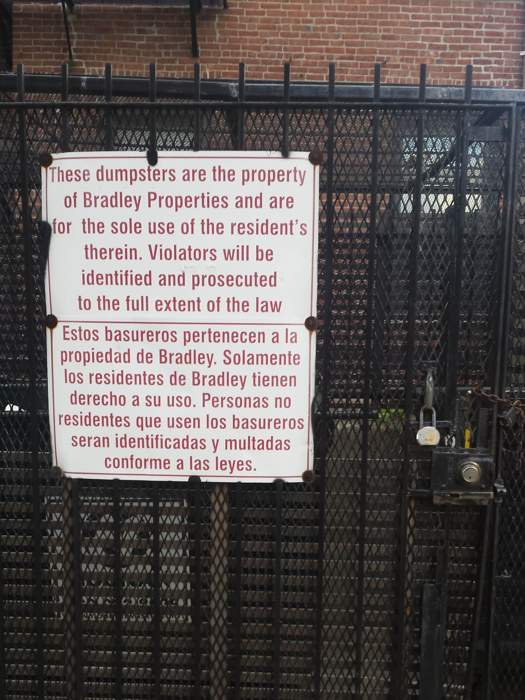The map above shows the distribution of renters in the South End, and the picture on the next page is a warning sign in an alley along the border of Villa Victoria and Tremont Street. The map most notably shows two neighborhood blocks – one northwest of Villa Victoria on Tremont that contains the most homeowners, an indicator of rootedness to the area, and the other in the northeast corner that has the most renters, an indicator of transience. Villa Victoria is in between both geographically and in percent of renters. This speaks to the economic and residential segregation of the South End by neighborhood. With an understanding of the ethnic make-up of the neighborhood, this map depicts three communities – white, Asian, and Latino. The picture of the warning sign is emblematic of the “this is mine, that’s yours” attitude thatplagues the area. At the border of the homeowner’s block and Villa Victoria, it stands as a