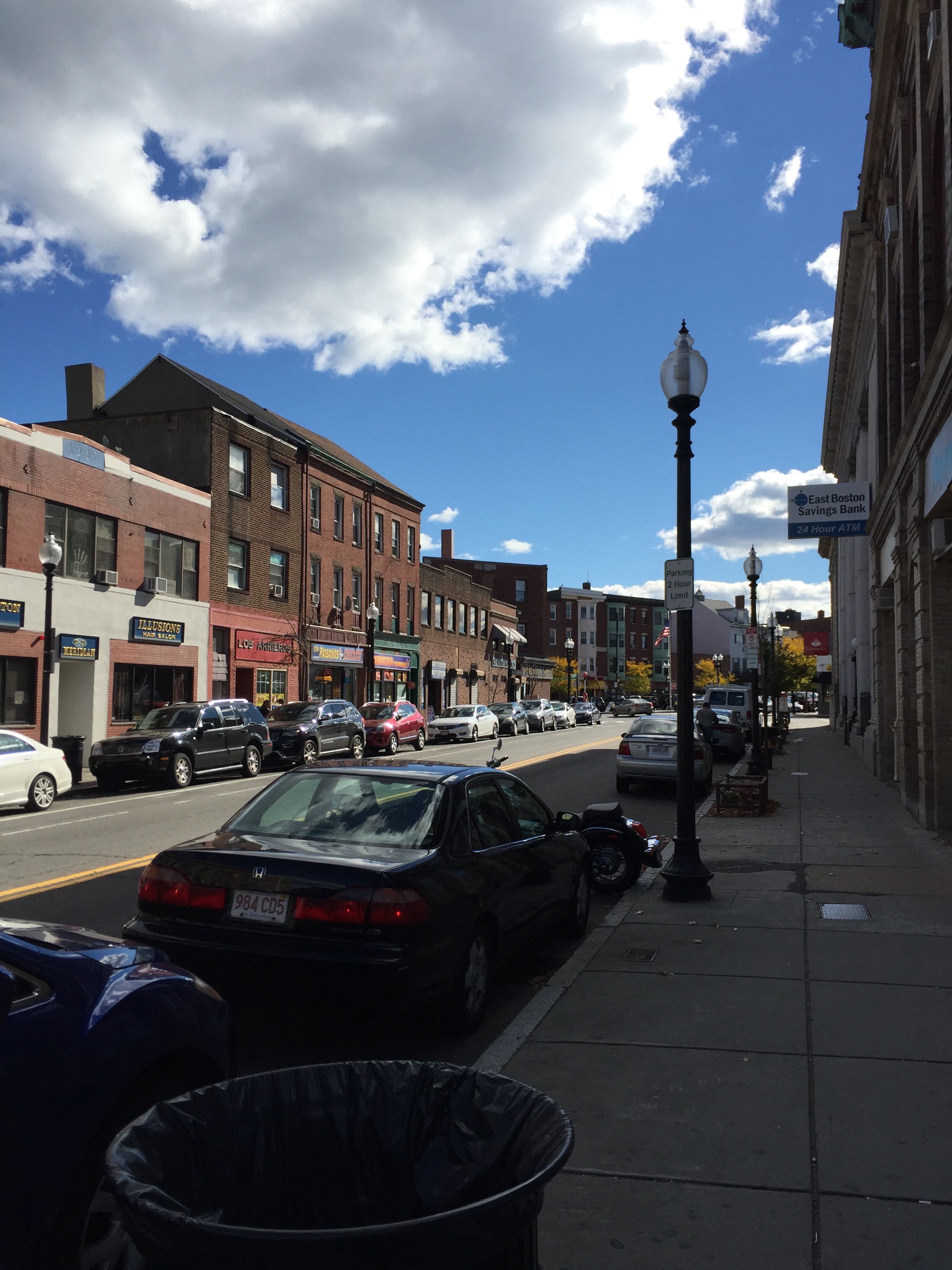 This photo of East Boston is taken in the middle of the Meridian Street. The right hand side is the west side of Meridian Street which is closer to the low income area while the left hand side is the east side of Meridian Street where all the affluent family resides. As you can see, at the right hand side, there is not much exciting stores while there are myriads of stores at the left hand side. This photograph precisely conveys the geographical segregation of income level in East Boston.