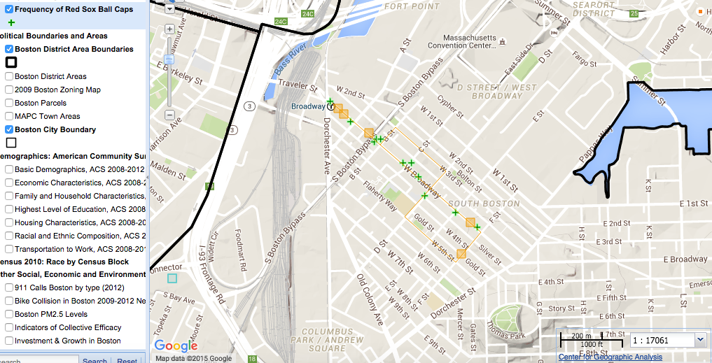 Map: This map is one which I created after my visit to South Boston. The green plus signs are spots where I saw people wearing Red Sox baseball caps. The notes, which appear here as yellow squares, indicate people I saw wearing apparel from other Boston professional sports teams, namely three people in Patriots hats, a man in a Bruins shirt, and a man in a Celtics hoodie. The yellow line shows the route which I walked on my visit.