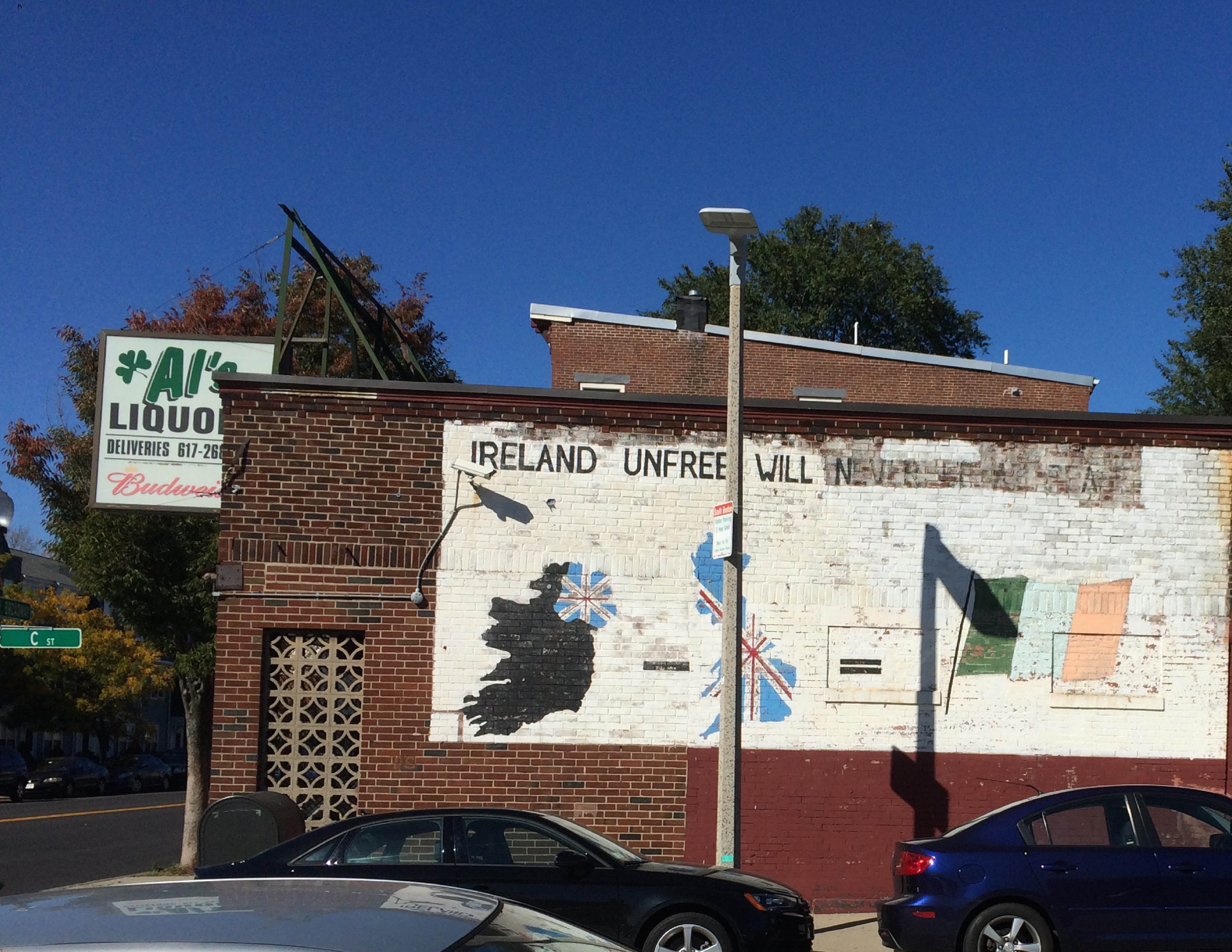 Photo: This photo shows the side of the building of Al's Liquor Store which I describe in my essay. This business is clearly very proud to be an Irish establishment in a strong Irish neighborhood. What is interesting is directly across the street from Al's, there is an invasion of new, pristine, and identical houses which cut through this image of the rough and tumble, working class Irish Southie. This is an instance when the quintessential Southie and what it could be becoming could be seen side by side, which was very striking.