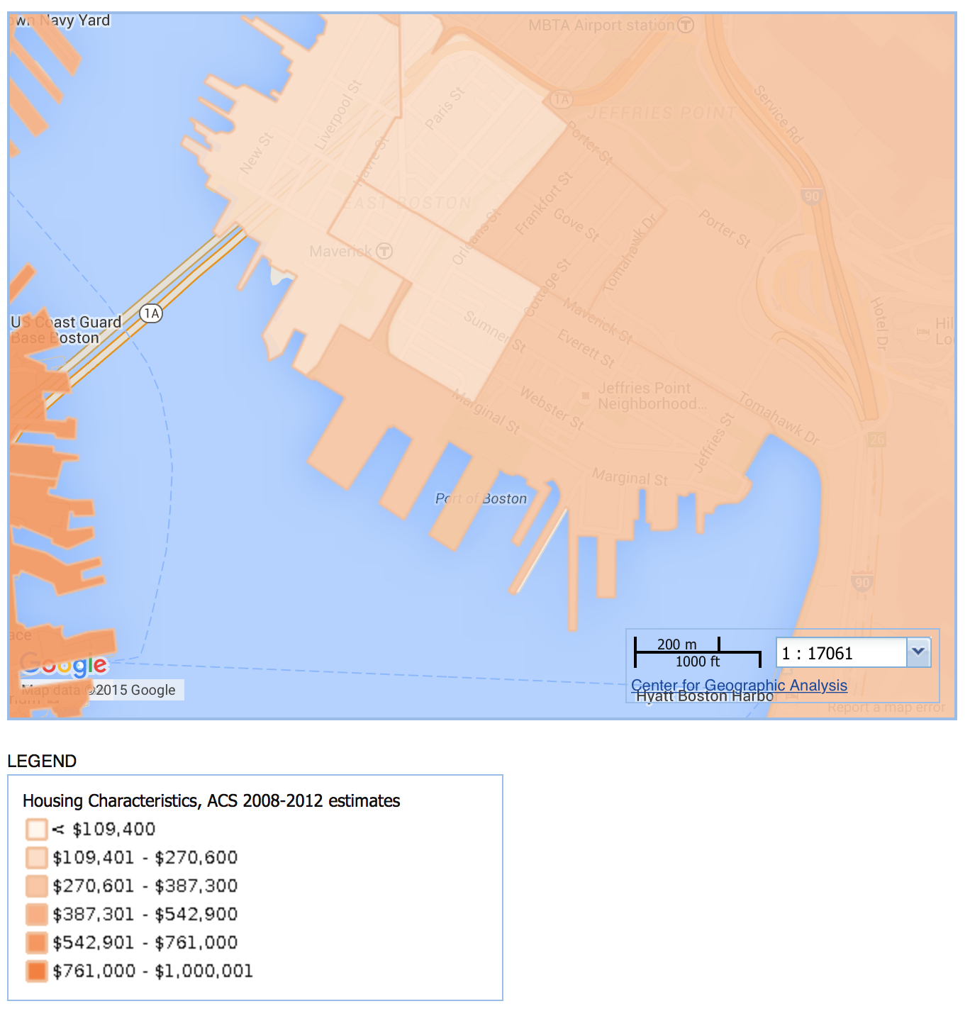 The photograph and map together show the socioeconomic divide in Jeffries Point neighborhood located in East Boston. The map illustrates that houses closer to the Boston Inner Harbor are more expensive than those near Maverick T Station. Thus, residents living near the harbor are of a higher social class than those inhabiting apartments closer to Maverick Square. The photographs present a visual indicator of this socioeconomic discrepancy in the form of flower pot decorations outside of people’s homes. The left photograph was taken in the part of the neighborhood closer to Maverick Square at the interesection of Sumner Street and Cottage Street. In the picture, none of the stretch of houses have flower pots outside their homes. The sidewalks also appear somewhat dirty, and there is some litter on the ground. The right photograph was taken near the intersection of Sumner Street and Jeffries Street in the portion of the neighborhood closer to Boston Inner Harbor. In the picture, there are more flower pots outside the homes of residents, and the streets appear cleaner and there are more street trees. Thus, looking at decorations can elucidate the socioeconomic boundaries of a neighborhood.