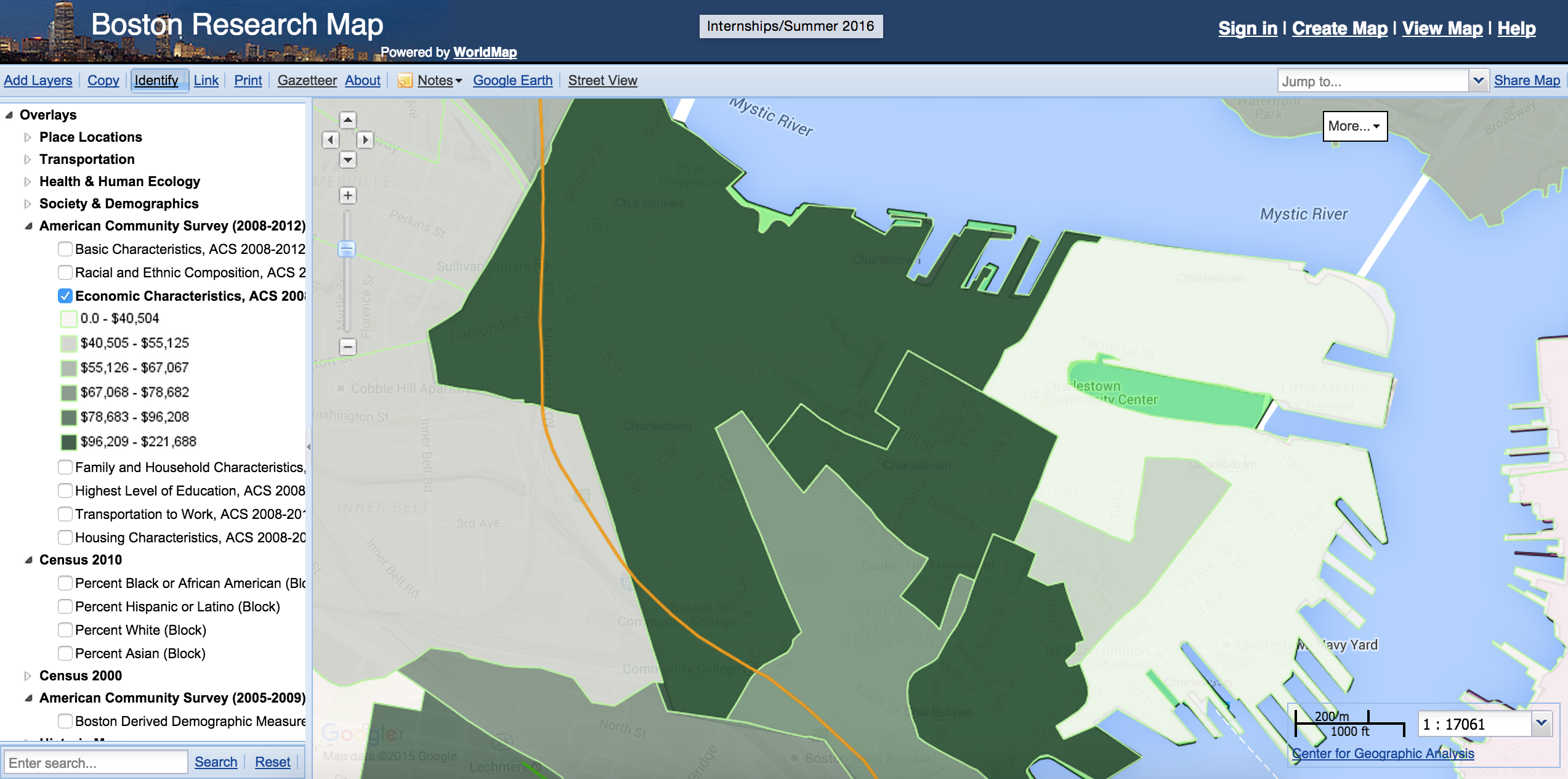 Selecting what to photograph in Charlestown was very difficult. Photographing the Halloween decorations, my indicator, on various houses revealed little about the neighborhood as a whole, and I wanted my photo to relate to my indicator. It was after I returned to the Bunker Hill Monument from the end of my walk that I realized if a large part of my analysis intended to focus on the distance from the monument and decrease in decorations, this is what I should show. Therefore, in my photo, the leftmost part of what is shown, the home with the American flag, is the first house I counted, which had the most decorations of any I saw, although they did not make it into the photo because of framing limitations. The rightmost side is the monument itself. This intends to demonstrate the extreme physical proximity between the start of the decorations and the monument, and subsequently what I interpret as high real estate prices and high family income. The map I choose to include shows the economic characteristics of the area. There are two maps because the economic overlay on map one is so dark that it covers street names entirely, so map two may be used as a point of reference. I started at the Bunker Hill Monument and traveled slightly southeast, down to Harvard Street.