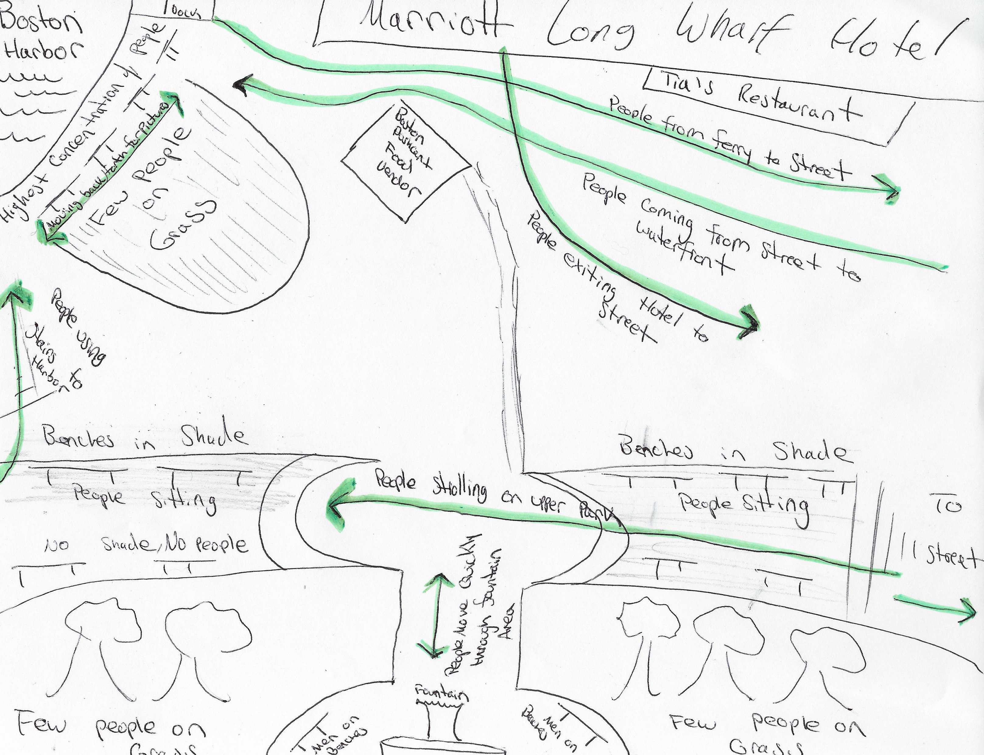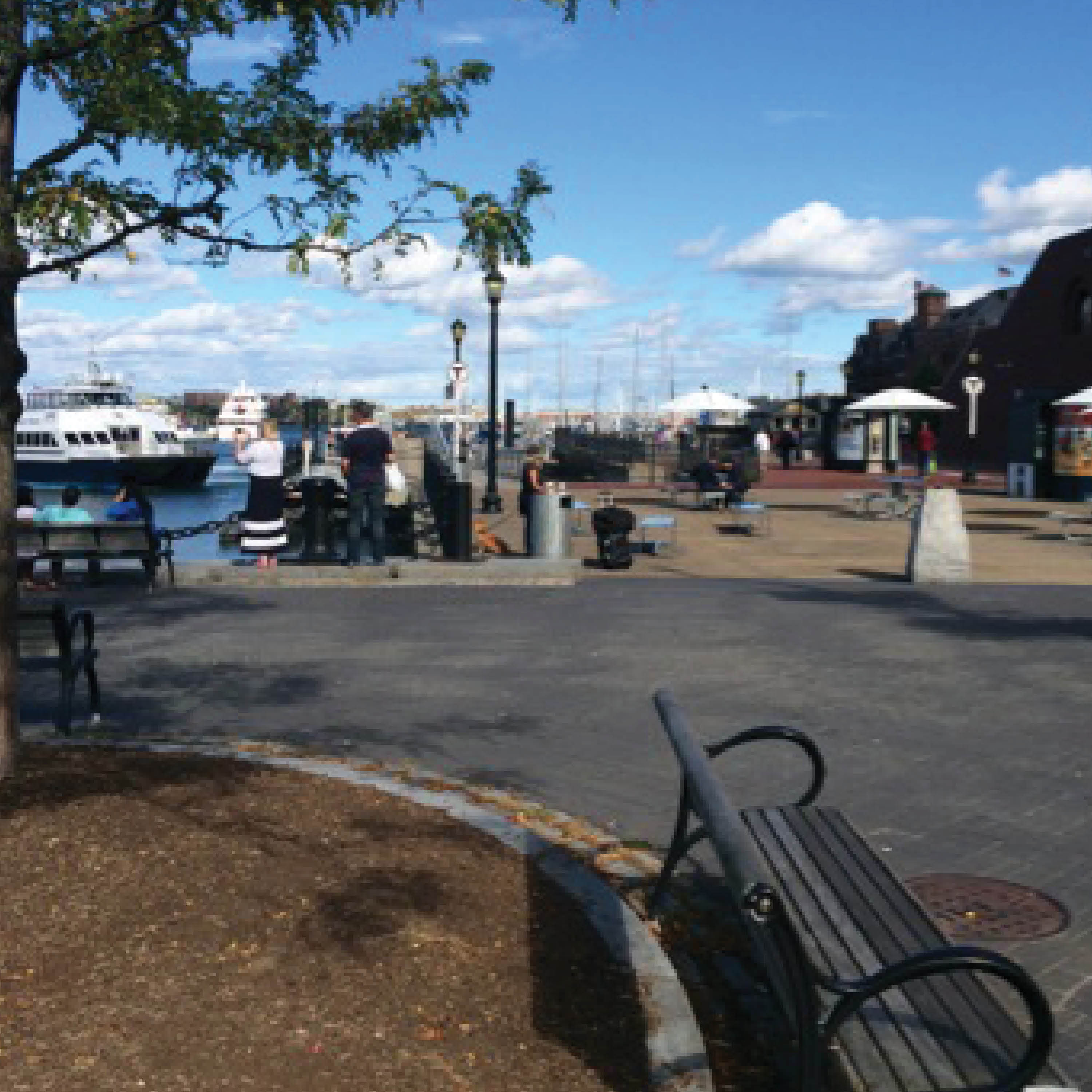 This photograph captures the essence of Long Wharf very authentically. Although the waterfront is concentrated with tourists taking photographs or people observing the waves, the space as a whole is not congested. People are using this space not solely to consume, but also to wait their dog, get to work, or just relax. Unlike at Faneuil Hall, there is a lot of room for comfortable solitude in this park. Long Wharf is also dotted with trees and greenery, providing an alternative to urban life. The bench in the foreground, much like many benches in this park, is not in the shade, and therefore seldom occupied. The picturesque sky and ocean front seen here is indicative of the quiet aesthetic of Long Wharf.